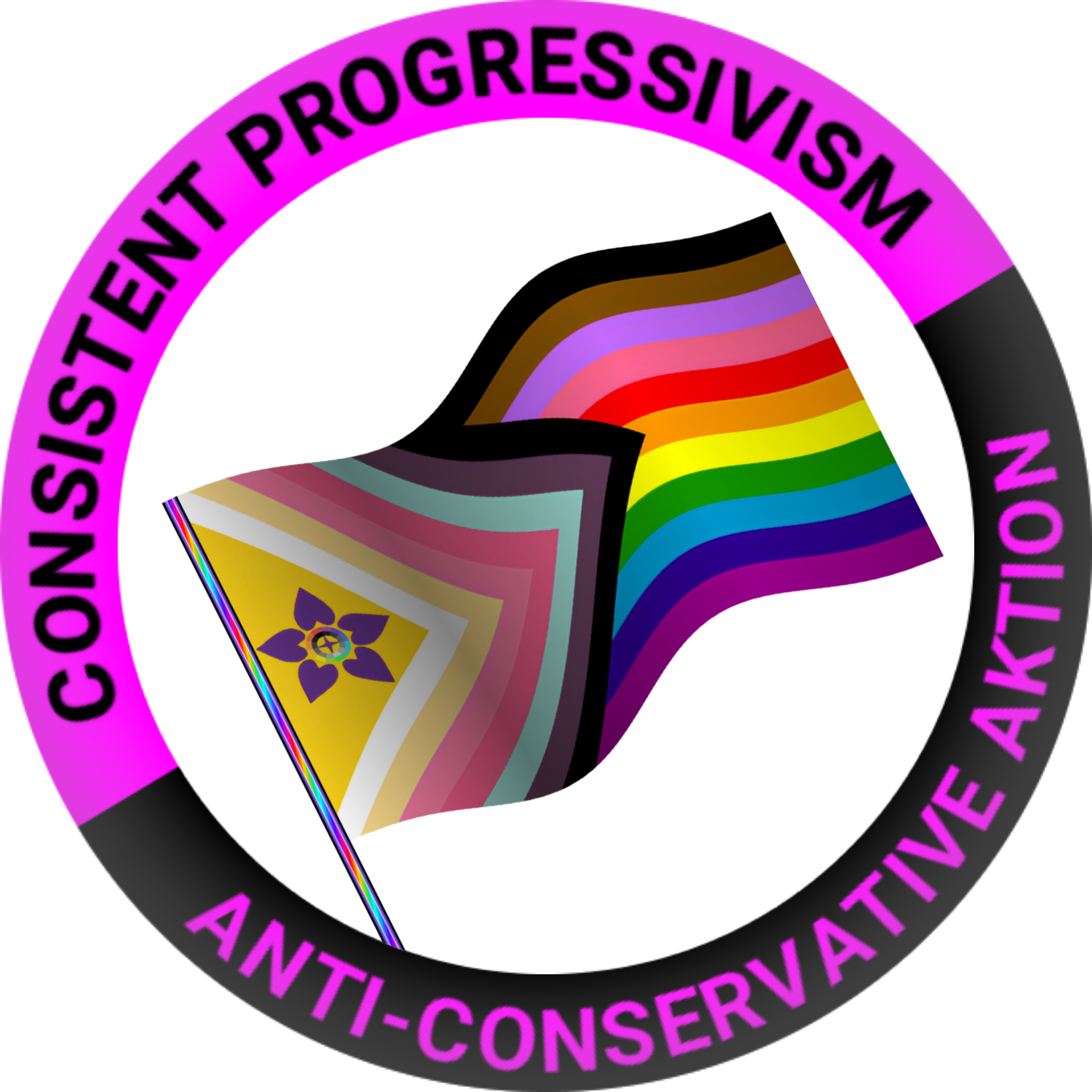 This flag was derived from maxrqstuff's LGBTQIAAPX+ flag and is largely similar to it both in design & meaning, except with two respective crucial differences; the first being that the original flag had a largely missed opportunity to use the MOGAI circle icon in its bold new flower design of the Intersex symbol, and the second being that because this new flag is explicitly a Consistent Progressive flag, it is incompatible with any ideologies other than Consistent Progressivism, and thus excludes all who do not follow it, who would be conservatives. As such this flag is also in full support of all of Consistent Progressivism, including the three fundamental rights of Freedom of Identity, Bodily Autonomy, and Free Love, along with all the Consistent Progressive theory documents, VSR theory, and a strict rigid pro-contact stance for every single identity.